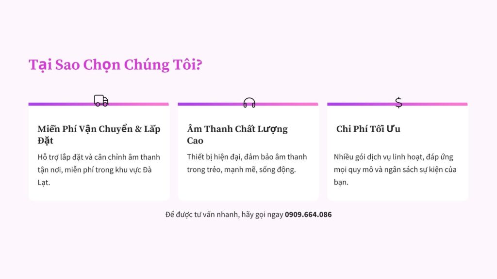 Bạn đang tìm kiếm dịch vụ cho thuê âm thanh chuyên nghiệp tại Đà Lạt để sự kiện của mình thêm phần trọn vẹn và thành công? Chúng tôi chuyên cung cấp các giải pháp âm thanh hiện đại, chất lượng cao, phù hợp với không gian và khí hậu đặc trưng của Đà Lạt, cùng đội ngũ kỹ thuật viên chuyên nghiệp, tận tâm.