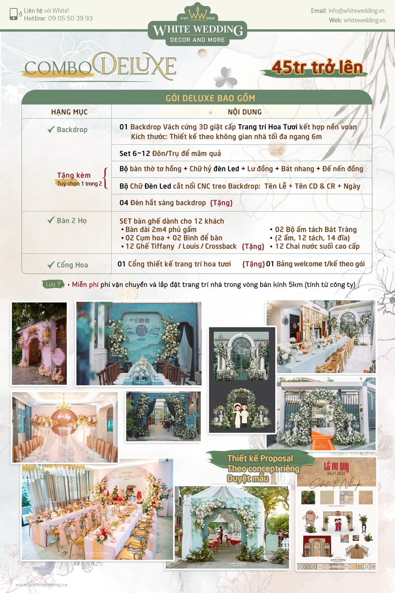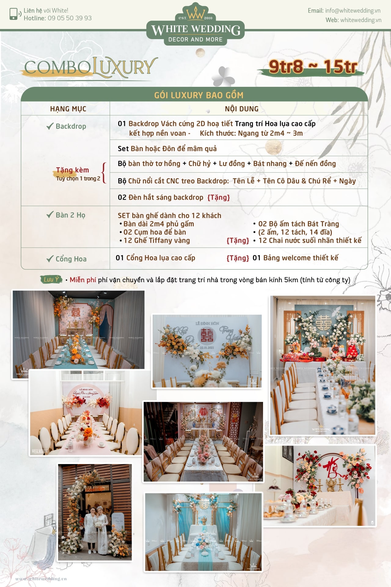 Với sự kết hợp các gói trang trí đa dạng về kiểu cách, chất liệu, giá cả và màu sắc – Chắc chắn sẽ đem lại sự hài lòng cho các cặp đôi khó tính nhất, góp phần toàn vẹn cho sự kiện trọng đại nhất của hai bạn.