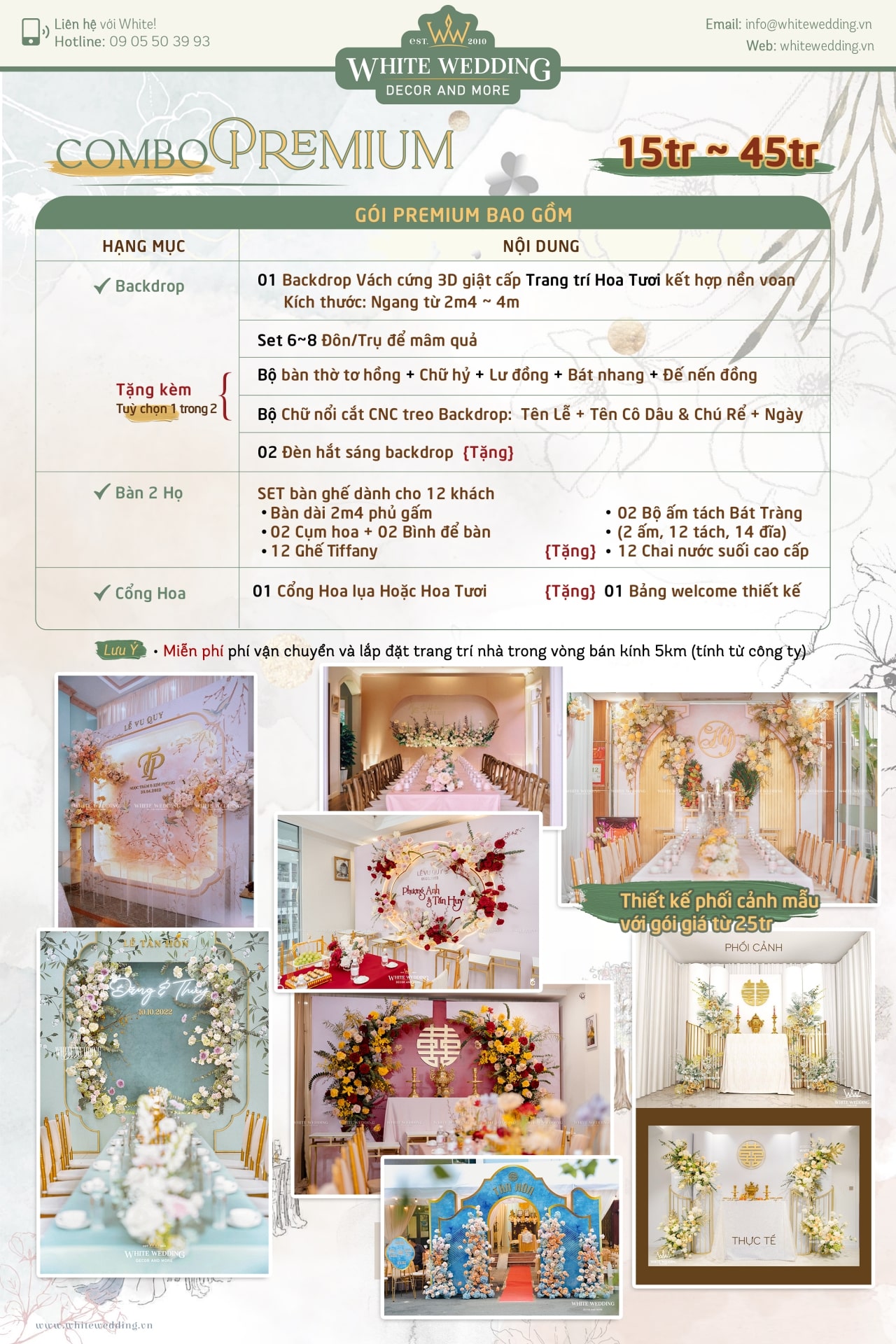 Đa số các cặp đôi thường chú trọng tập trung cho việc tìm nhà hàng, chụp hình cưới, trang trí tiệc cưới tại nhà hàng mà quên không chú trọng để chuẩn bị cho LỄ GIA TIÊN & LỄ RƯỚC DÂU. Bạn không có thời gian và đắn đo không biết nên trang hoàng nhà mình như thế nào? WHITE WEDDING đã phát triển gói dịch vụ TRỌN GÓI TRANG TRÍ NHÀ & MÂM QUẢ, bao gồm các dịch vụ cơ bản nhất để chuẩn bị cho LỄ GIA TIÊN & LỄ RƯỚC DÂU.